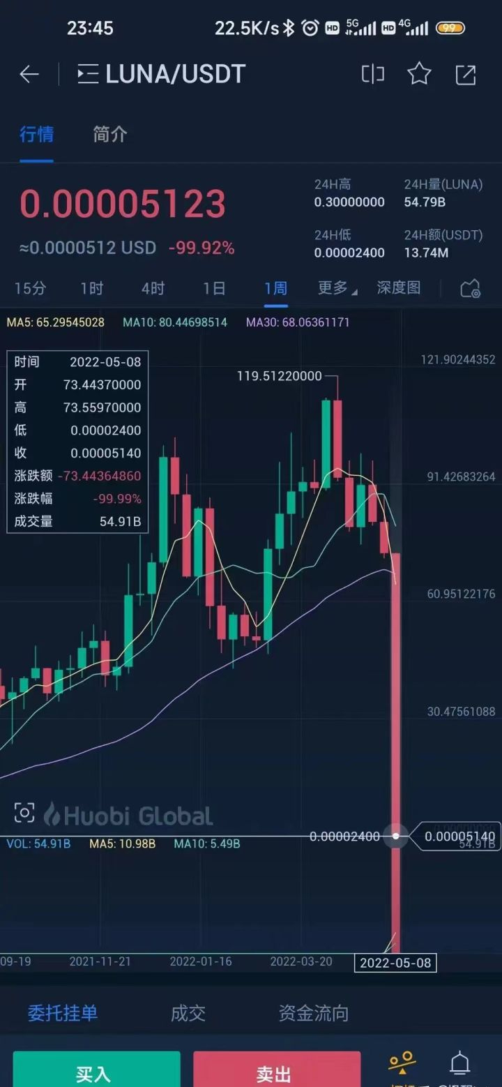 虽然发行的时候,价格才0.12美元。但是前几年虚拟货币投资热,使得LUNA价格也随之飞涨,到今年4月份的时候,价格更是达到最高的119.18美元。