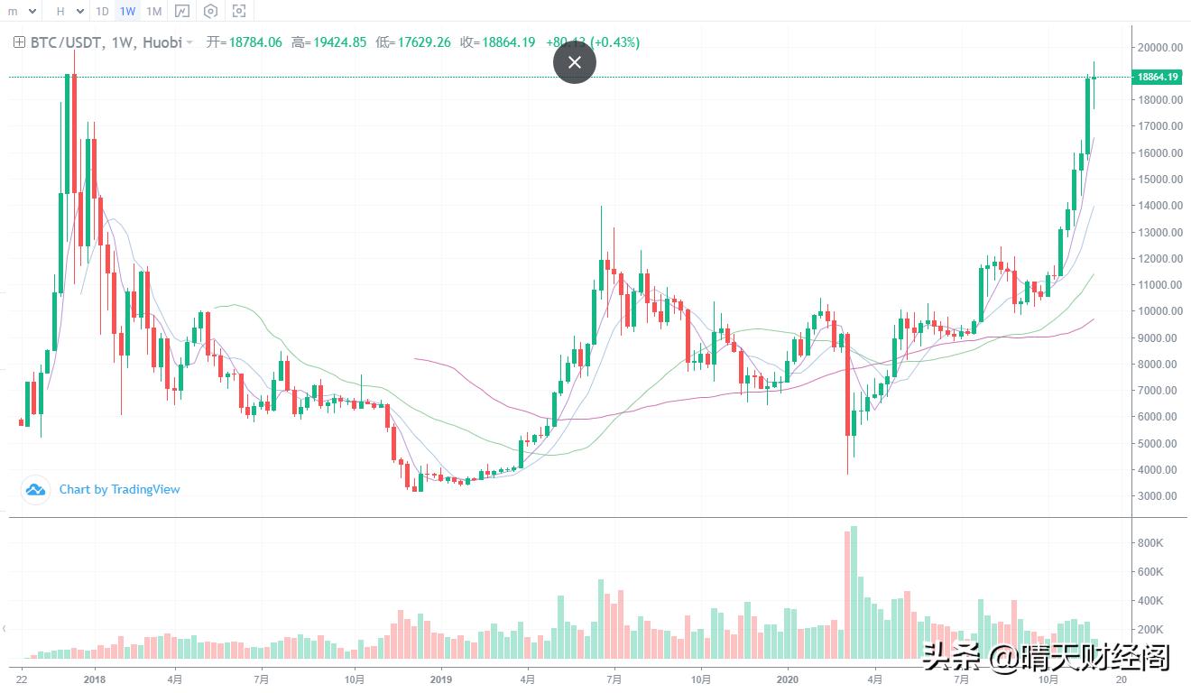 进入2020年以后除过3月份的黑天鹅事件导致比特币的价格严重失真下跌到了3800美元,这波上涨趋势截止到目前为止,最高点始终没能突破2万美元止步在了19500美元附近。11月26日美国的感恩节,也就是今天,比特币迎来了2000美元的下跌幅度,从19000 美元一路下跌至最近17000美元。