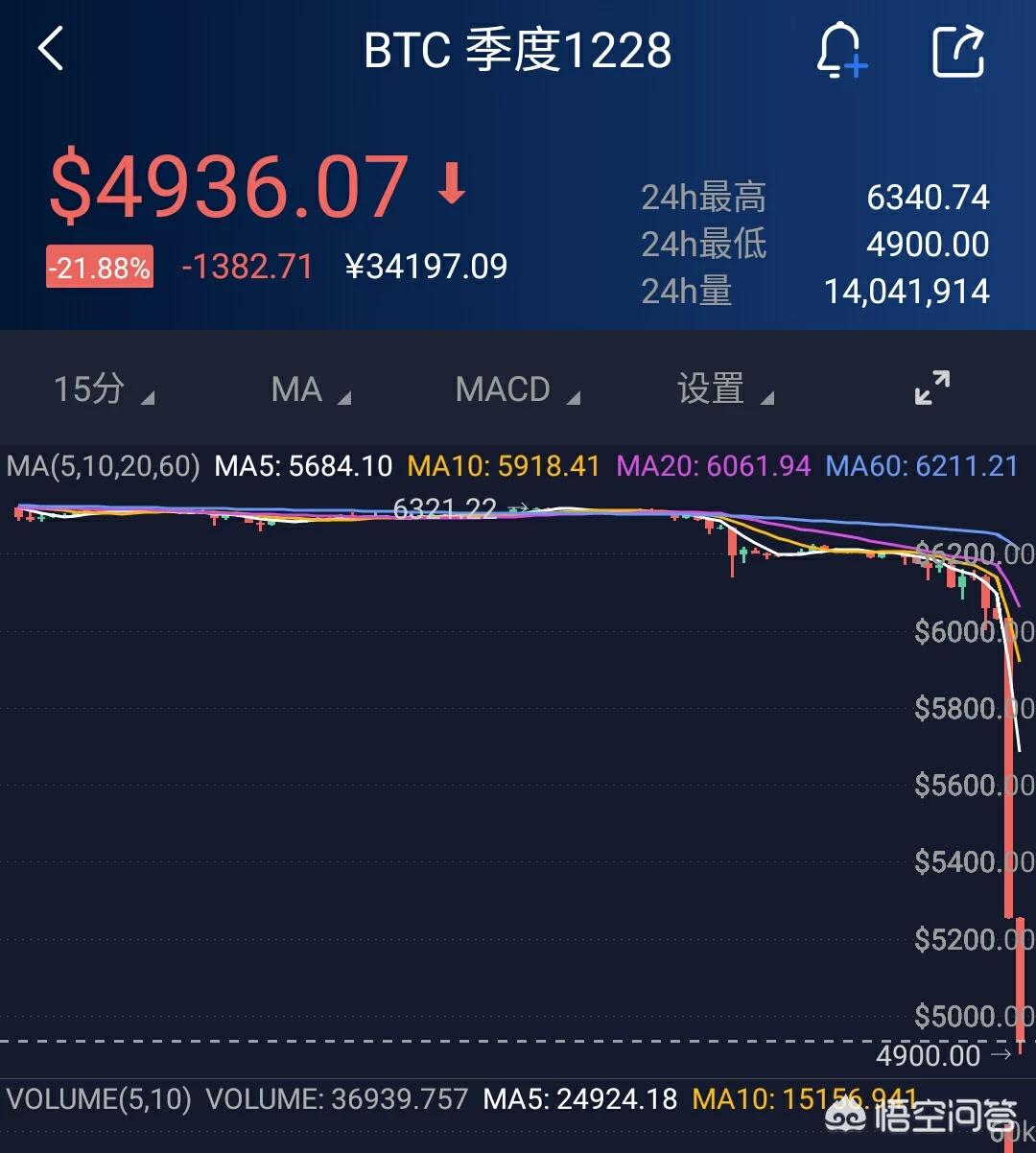 在之前的回答中就算多次提到过,至少会有一次回踩5800美元或者是5700美元前低可能。年底行情的开启一定会有一次深V走势的出现,并且参考当前的熊市大背景行情和场内存量资金不足2000亿美元的尴尬局面都是不稳定因素,只是没想到这次会直接以期货市场的放量下跌为主并且在昨天晚上就突破了4900美元。