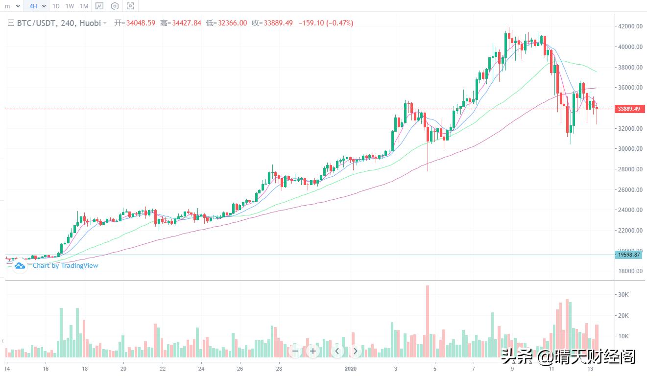 从技术点面上来看的话目前的行情属于牛市回调,如果经历过2017年比特币上一波牛市周期的投资者朋友应该十分清楚,在牛市行情中动辄回撤30%甚至于40%的大回调行情是比较常见的。而截至于13日的比特币后续行情演变来看,4小时已经迎来了相对应的反弹,并且将反弹的高点确定在了3.7万美元附近。