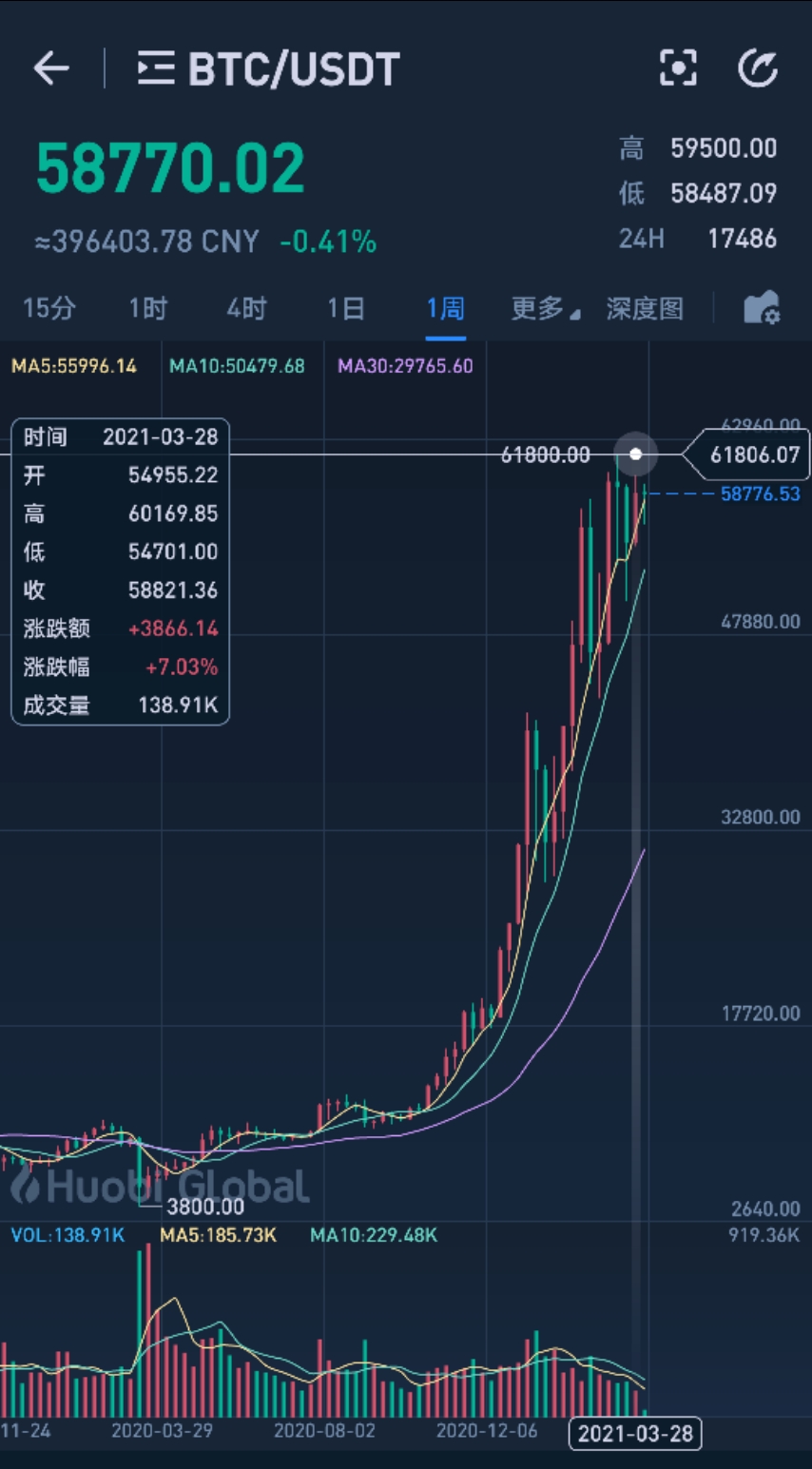 下面这是最新的比特币价格,2021年4月份,也是周线图,价格在58000美元左右,换成人民币大概在40万左右。