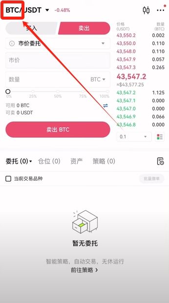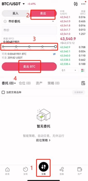 如果想把比特币卖掉也是同样的道理。进入到交易页面,点击【卖出】,数量拉满,点击【卖出BTC】就可以把比特币换成USDT。