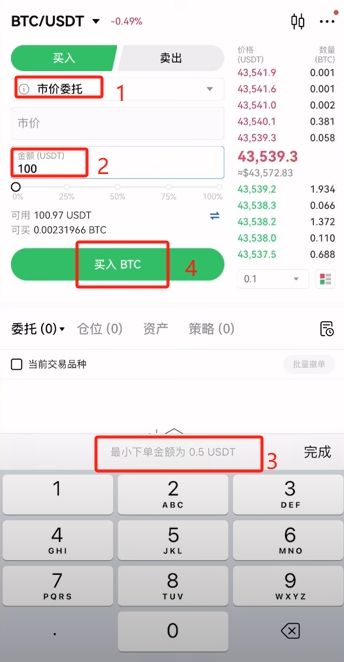 下方显示“最小下单金额0.5USDT”,也就是说,我们购买比特币只要超过了0.5U就能购买。也就是说虽然现在比特币的价格很高。但是没关系,因为我们不必一次购买1个比特币,或者必须购买0.1个比特币。最少0.5U就可以买比特币。
