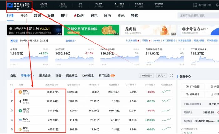 你可能会说不知道自己想买的币它的缩写是什么,我们可以去“非小号”来查询对应的缩写。这里有各种数字货币的介绍。有中文名、英文名、价格、市值等等。在这里找到你需要买的数字货币。