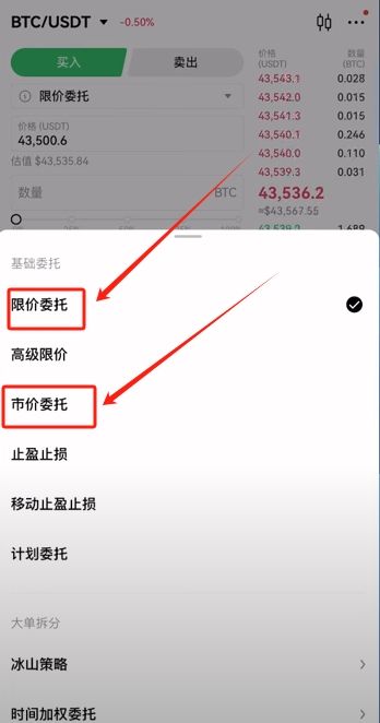 选择下方方式,这里主要用到的是限价委托和市价委托。