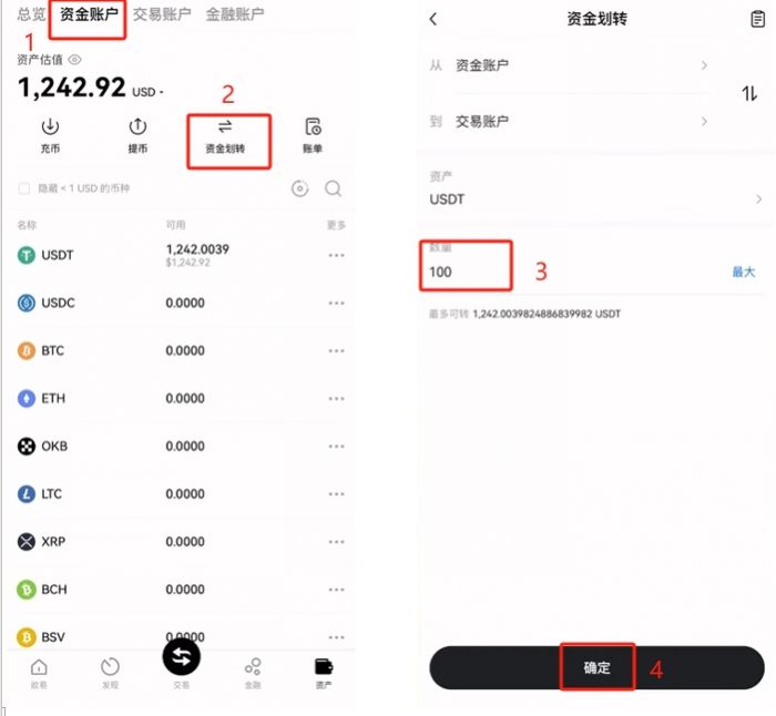当我们买完U之后,USDT就在我们的资金账户里。如果我们需要去买其他的数字货币就需要把资金账户里的USDT转移到交易账户里。点击【资金划转】。