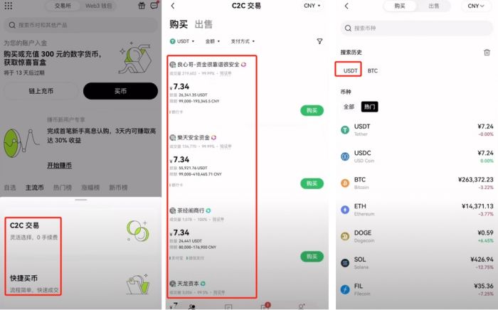 简单来说就是通过欧意的快捷买币或者是C2C买币。然后欧意会给你匹配出跟你交易的商家。