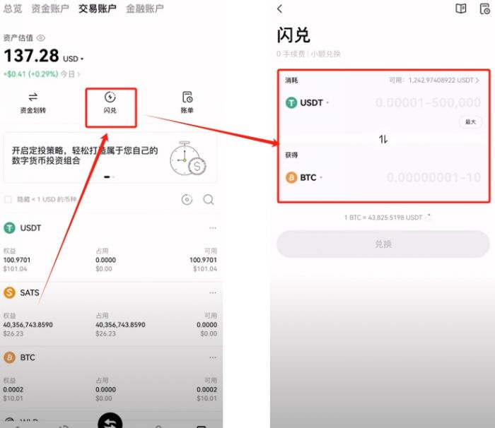 现在我们的交易账户里已经有足够的U去买比特币了。可以直接点击【闪兑】闪兑相当于你输入需要买的U,然后他直接就给你兑换成比特币。但这种方式并不推荐。因为会有一些损耗,价格并不是很好。但是如果你比较着急,想立刻就要比特币,你就可以通过这种方式来操作。