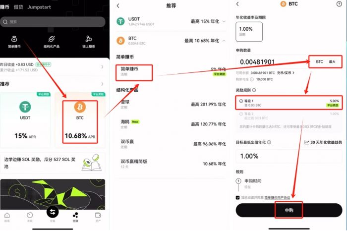这里有一个BTC的页面我们点击进去。点击【简单赚币】,点击【最大】,把我的BTC全都投到里面。可以看到它是有限额的,就是只对你的0.03个比特币有平台的补贴是年化5%的收益。我现在的金额肯定是没到。那我就直接点击【申购】就完成了。