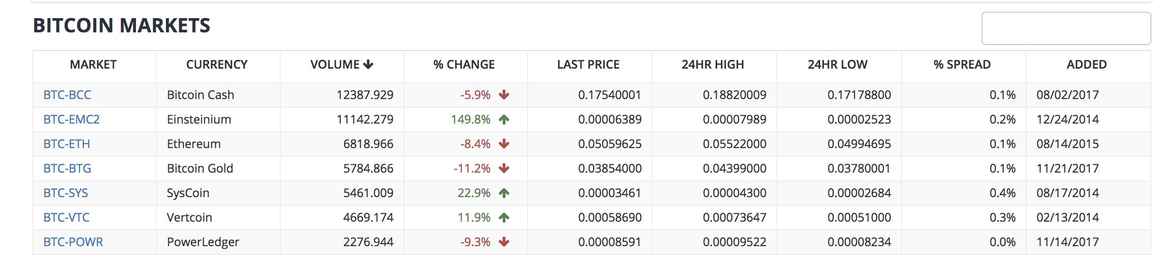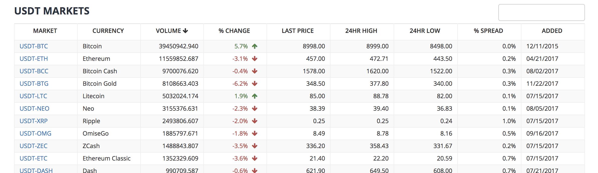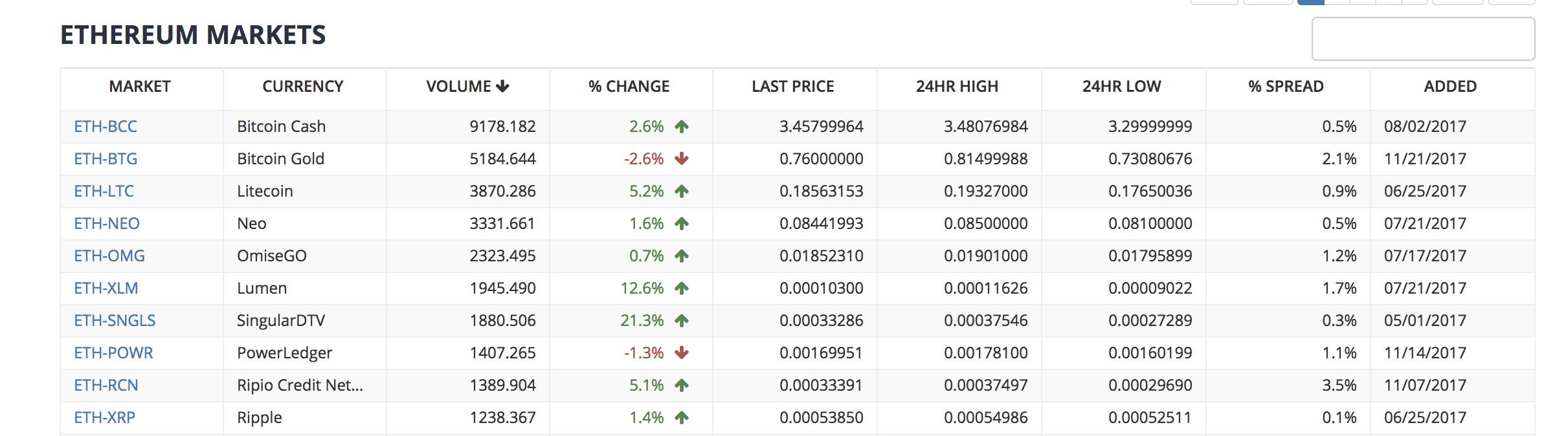 国外比特币的交易为币币交易,一般充值比特币,以太坊或者usdt到交易平台,用这三个币来买其他的币种,其中usdt是美元锚定的代币,1美元等于1usdt。这又涉及到一个法币提现的过程,如果要提现美元,可以把币卖成usdt,然后1usdt对应1美元,直接提现美元就可以。下面给你看一下国外最大最老牌的两个交易平台的币种截图。