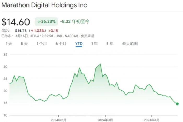 相较于比特币价格,到目前为止,“减半”似乎对Marathon Digital等比特币矿商的股价影响更大。