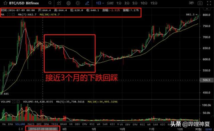 因为现在是减半的敏感时期,我们以历史上的减半为例来分析。我们看历史上最近的第二次减产是2016年7月9日,块奖励由25个减少到12.5个。减产前的4月份价格由400美元暴涨至6月份的800美元附近,价格涨了两倍。减半前一个月价格缓慢回调,7月10号当时价格664刀。后面先是经历一段为期三个月的回踩下跌,接近7个月横盘,震荡上行。在经历了近10个月的横盘之后,在第二年年末价格达到了最高两万刀。而今年年初的浮动来看,年初到2月低,市场对于BTC等减半币种的参与程度很高,价格一度突破1万美元,按照上次的走势,年初BTC的走势也有相似之处。但是受到全球经济的影响,3月中旬,BTC出现大量资金离场的状况,走势一度出现病态,而目前在全球经济情况不明朗的局势下,BTC在慢慢走出了独立的行情,震荡上行。目前已经站在30日的均线上,走势整体来说正在慢慢恢复健康。