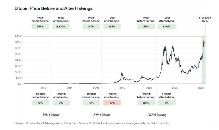 对此,加密货币资产管理公司、同时也是比特币现货ETF 的发行商 Bitwise 在16 日分析,过去三次比特币减半后一个月内,比特币走势可能会震荡,但在接下来一年内,币价会出现至少三位数百分比的涨幅: