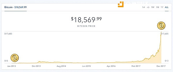实际上,自2015年开始,比特币的价格就一直保持着增长趋势,也是2015和2016年全世界表现最好的货币。到了2017年初,比特币价格超过1000美元,之后每月都以惊人的速度增长。今年三月,比特币价格超过了一盎司黄金现货价格,也是比特币历史上的一个重要里程碑。但是,和9万亿的全球黄金市值相比,比特币市值规模依然较小。尽管如此,比特币市值规模还是超过了不少企业实体和股票,比如比特币市值远大于PayPal、IBM、迪士尼、通用电器、麦当劳等企业,甚至比全球艺术品市场规模还要大。