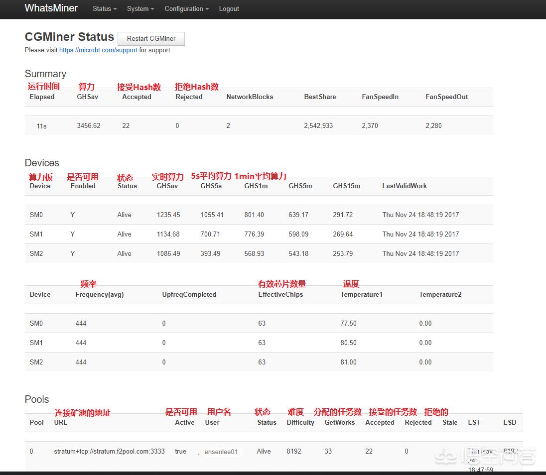 初此用户名密码均为:root,登录到设置界面,我们可以看到矿机的默认设置参数和运行状态。