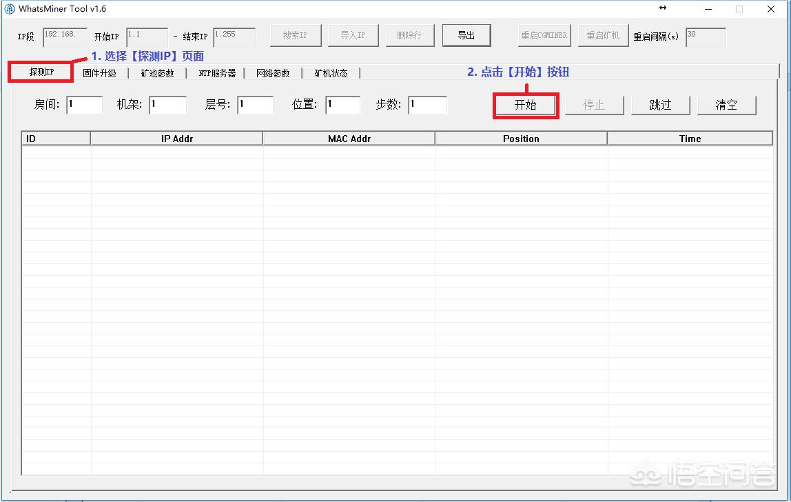 点击“探测IP”,再点击开始按钮,此时软件会自动探测矿机IP地址。