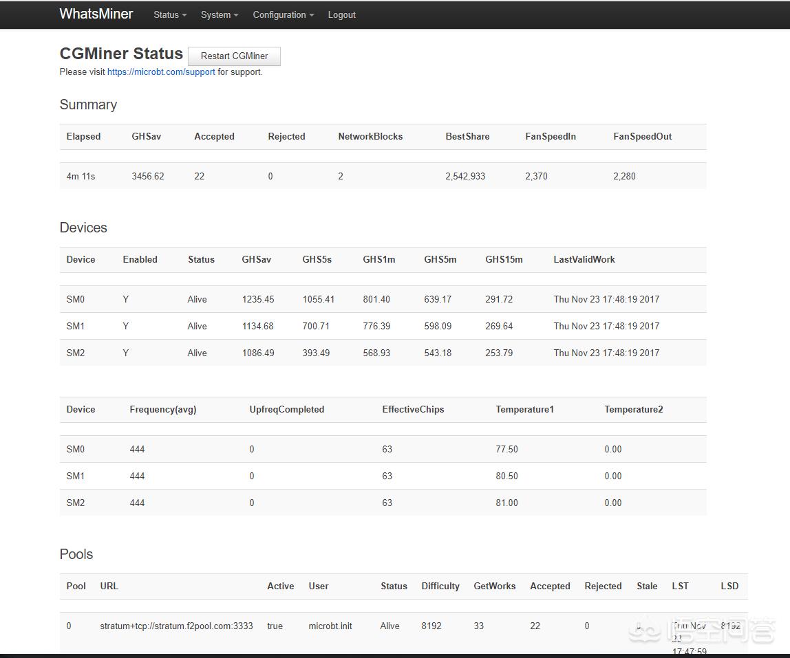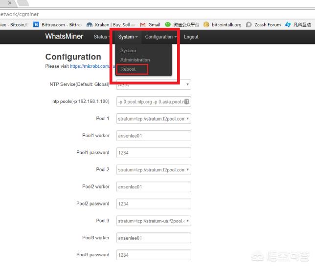设置好参数后需要重启矿机才能生效,在顶部找到“System”,选择“Rebooot”重启。