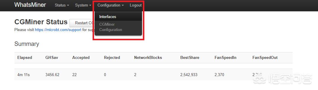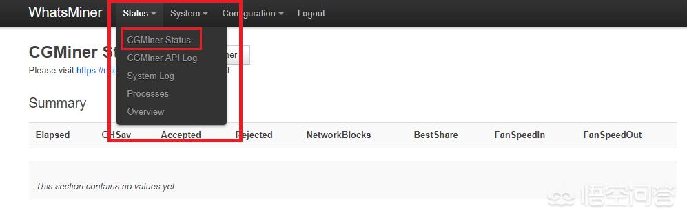重启完成后,点击顶部“Status”,选择“CGMiner Status”(挖矿状态)