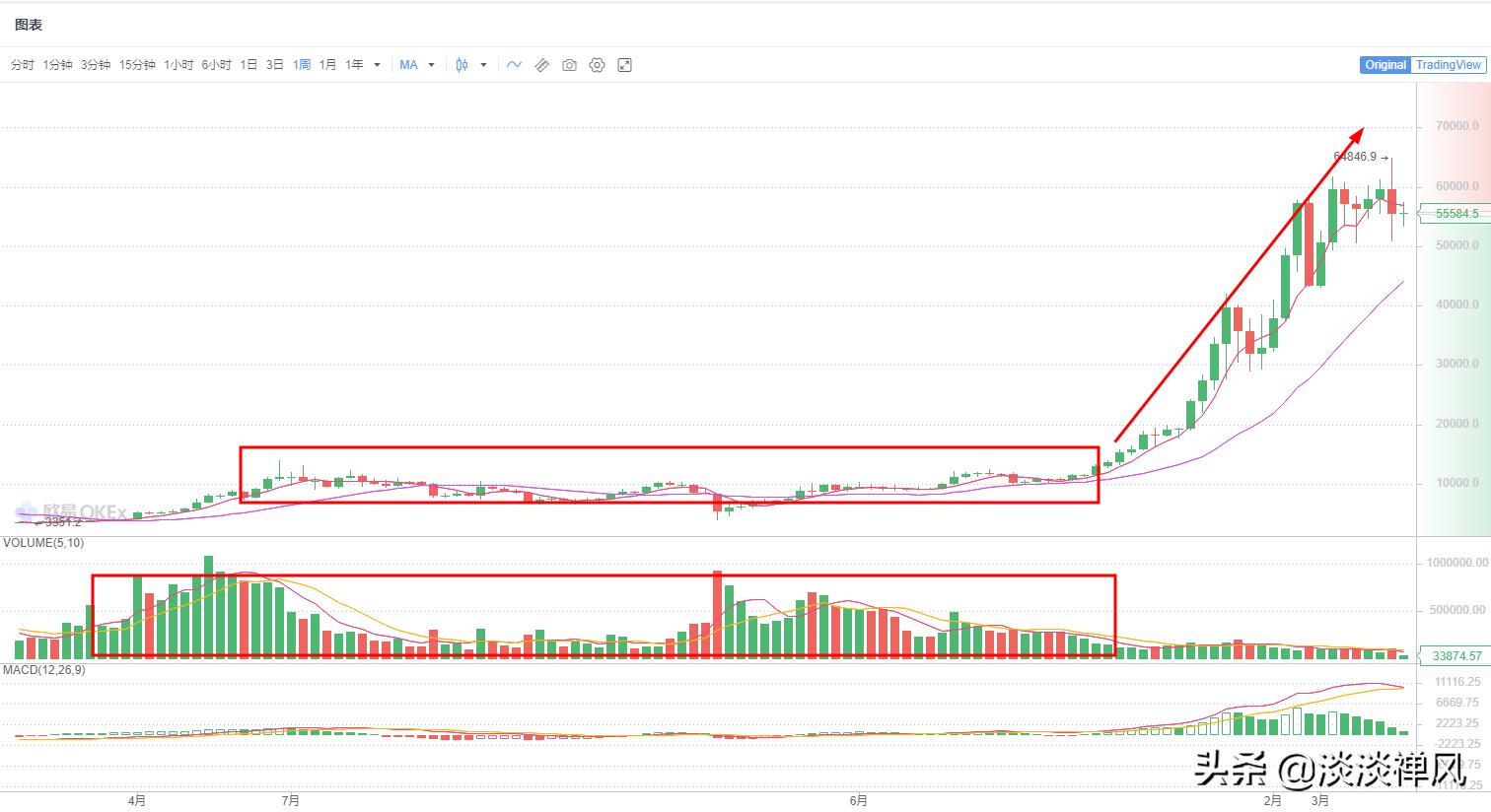 比特币在10000万美元附近做了一大平台,这个平台明显有机会进入,也就是前面我们说的各大机构,平台构筑结束,开启缩量上涨。我们知道,比特币上限只有2100万枚,在价格低时想控盘比较容易,如上图所示,在10000美元区域明显有机构进场控盘了走势,然后才会出现缩量上涨的行情。换言之,在放量前,所有的调整都是进场的机会,在没有放量前,这个上涨趋势都不会变,就算后面有调整,最多也就调整到这个平台,因此,技术面看,很难再跌回两三位数。