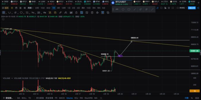 那么早间的视频更新是建议大伙进行多单的部署,已经暴赚了,没有操作的伙伴可以留意接下来会不会回踩63k附近,只要不是很大的空头放量跌下去,回踩支撑是可以尝试做多的,这个区间反转信号已经出现,59k估计是不会这么明显插破给大家机会了。