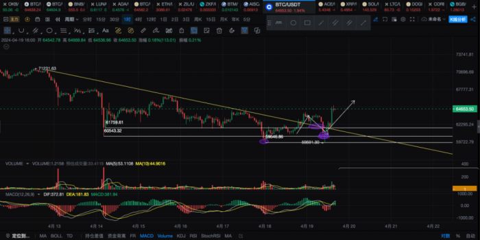 今天BTC出现了有力的反弹,价格最高已经打到65k,维持在64k盘整,那么昨晚突破趋势线过后,价格并没有能够起稳趋势线上方,而是再次对前低进行跌破洗盘,然后强有力的反弹出现,所以空头衰竭信号是出现了,我们期待的59k插针行情估计是不会出现了。