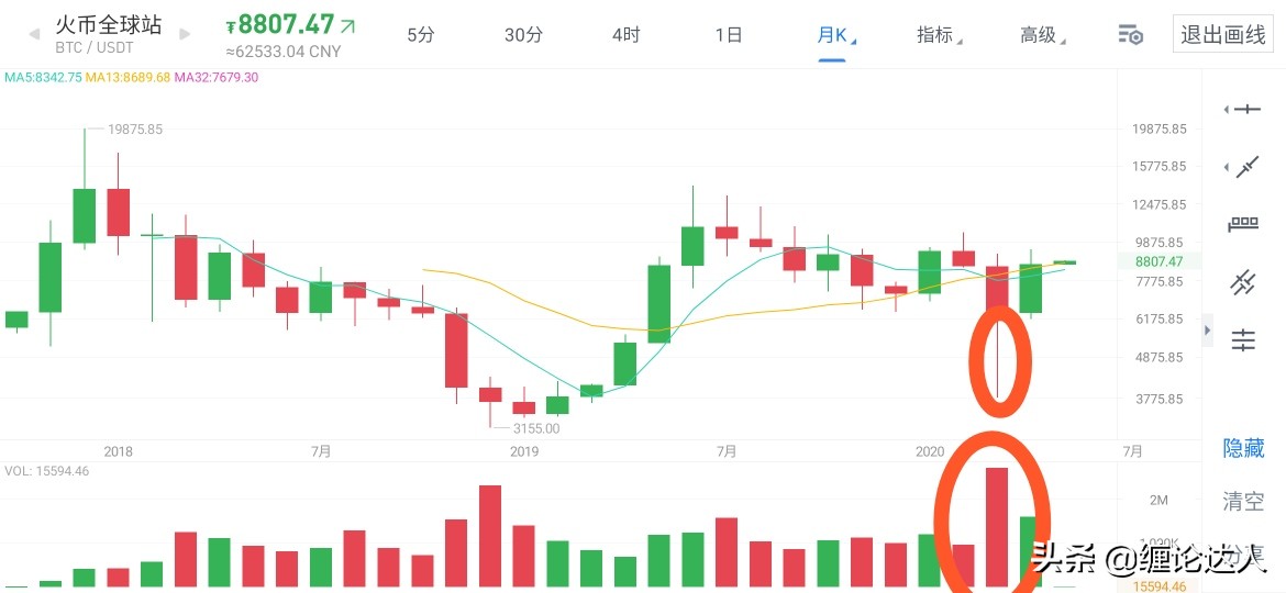 这是一张比特币月线的k线图,可以看到3月份月线收了一根超长下影线加上放出了巨量,证明有很多人在这卖,同时也说明了很多人在这买。
