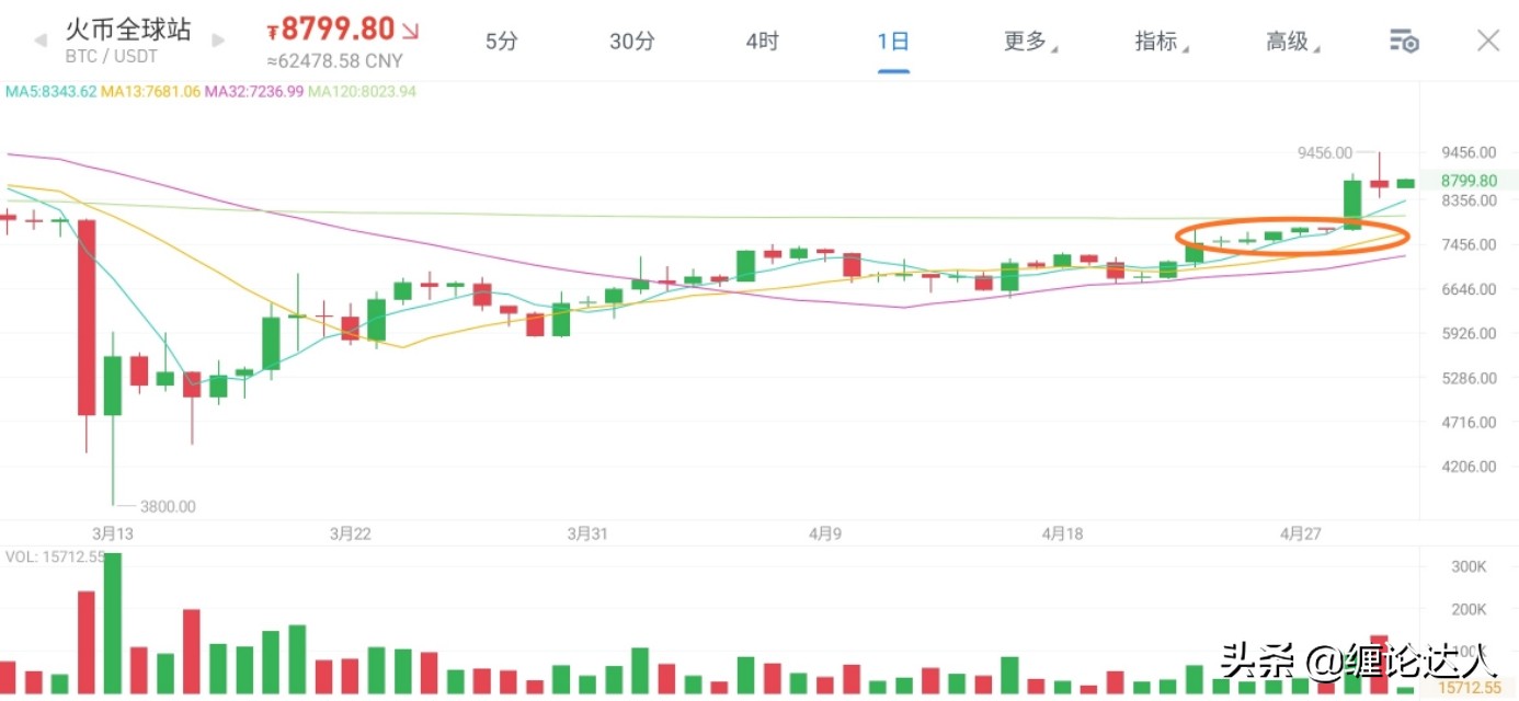 我们可以看到从4月24号到4月28号足足横了有5天,这五天一直在窄幅震荡,把上面的筹码都洗了下来,同时接住筹码。一直蓄势,直到4月29号才突破,后来因为惯性一举突破9000美金。
