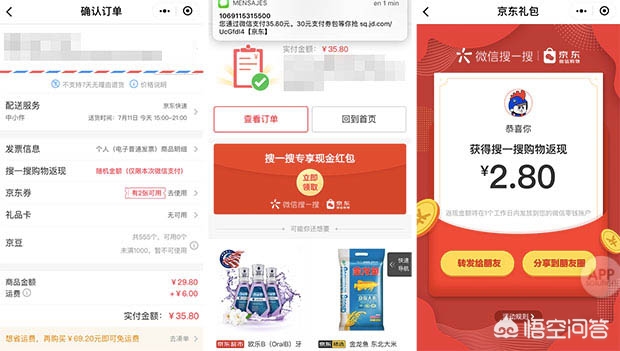 虽然凡是用到「随机」二字的优惠,通常都是属于玄学范围,但实测显示京东还是挺厚道的,比如这袋 29.8 元的大米(嗯是的,没钱测试买 iPhone),开出来的红包是 2.8 元,相当于约 1% 的返现,这与京东给第三方平台的返现率相当。