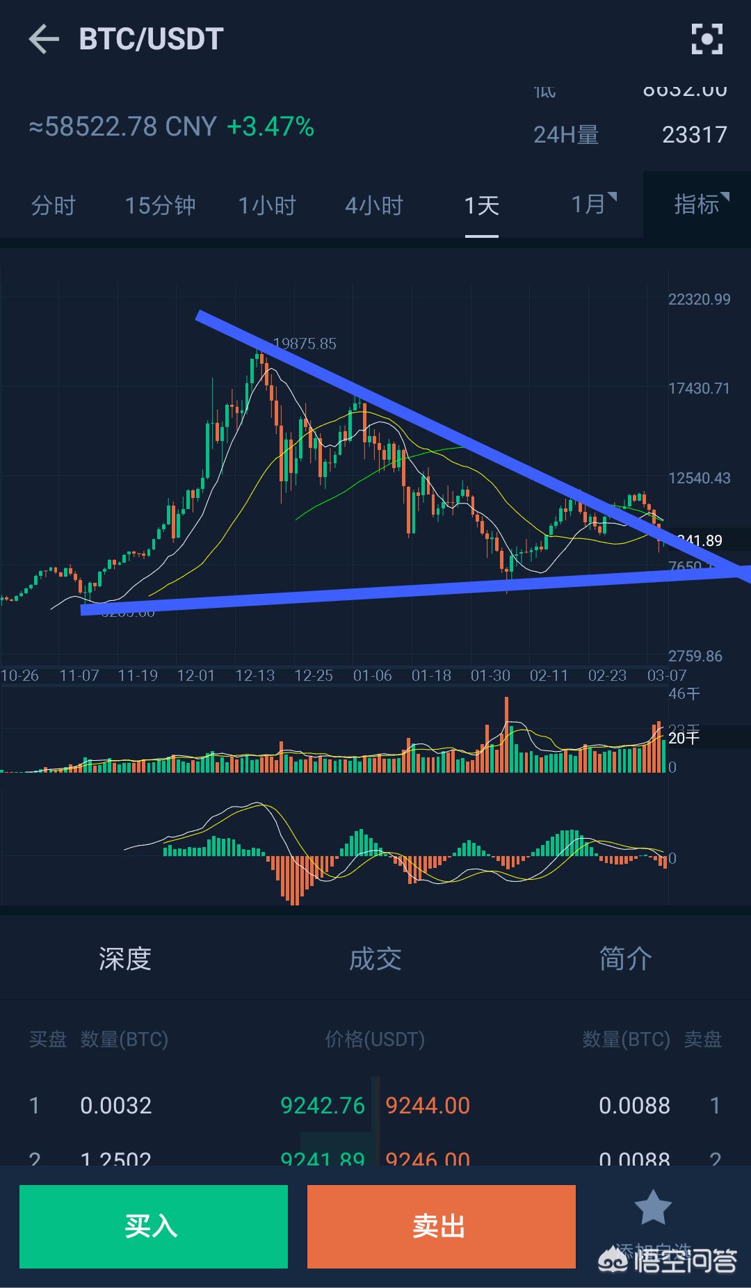 但我们看看比特币走势图,暂时在上升趋势线的上方。