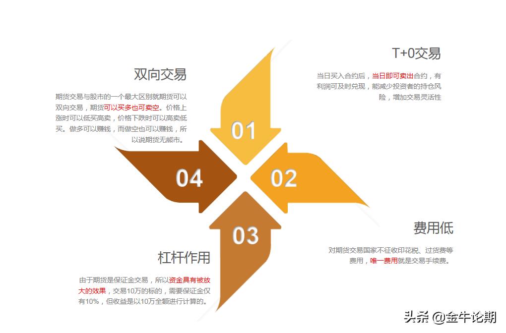 不过期货交易和传统的现货交易虽然原理相通,但还是有一些交易机制不一样,传统的现货交易很简单,期货交易扩展了一些功能,比如期货可以用10%的资金(保证金)来撬动10倍价值的商品交易,相当于你的资金放大了10倍,而且没有利息。期货除了价格上涨可以赚钱外,价格下跌也可以赚钱(放空)。此外T 0交易制度,让你随时都可以自由的进出,买卖。