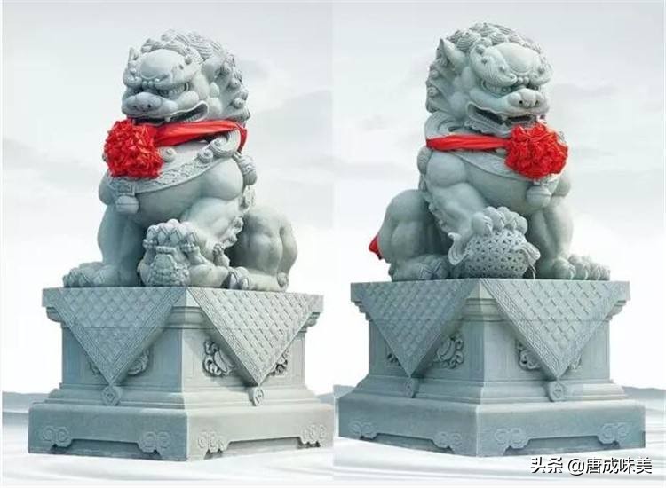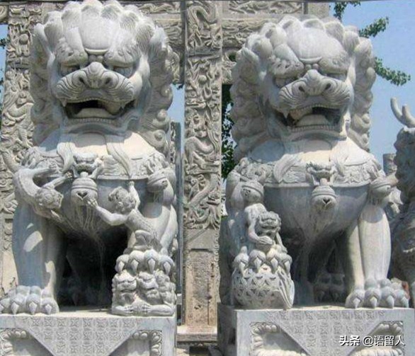 最后再告诉您个小秘密,别看石狮子风吹日晒怪可怜的,但它可不孤独,一般都是摆一对儿,脚下踩球的是公的,踩小狮子的是母的。