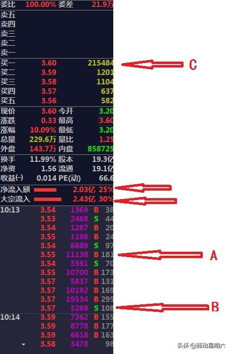 1;A:表示在时间10点13分后的一笔成交单,这个成交单包含了181个挂单,意思就是说在3.55这个价位,在这个时间节点上,撮合成交了181个挂单,共11138手。