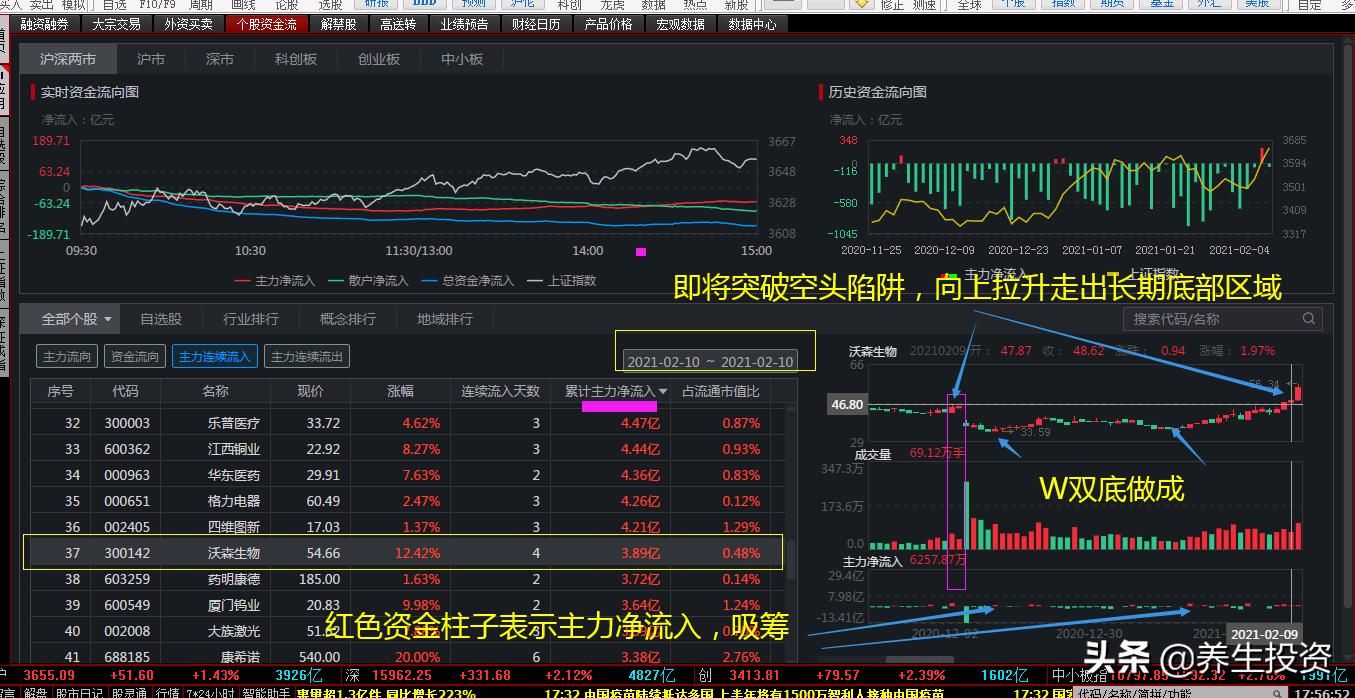 当2021年2月10日向上拉升、走出底部区域之前,从股票分析软件可以清楚看到,已经连续三个交易日,都是主力净流入。如此,主力运作的过程和动向,借助股票分析软件,就可以超前和实时观察到、分析出来,以便及时制订和实施操作,甚至实时跟进。