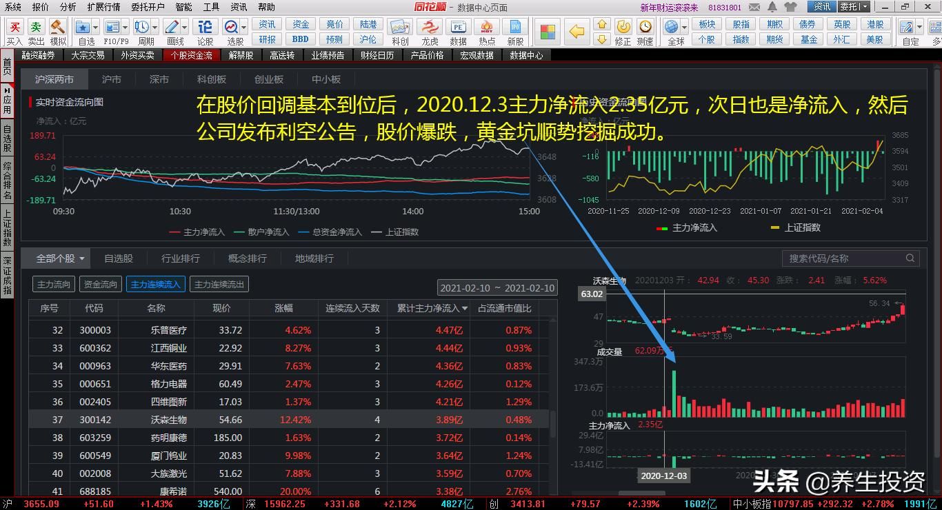 在股价回调基本到位后,2020.12.3主力净流入2.35亿元,次日也是净流入,然后公司发布利空公告,股价暴跌,黄金坑顺势挖掘成功。详见附图1:主力挖掘黄金坑成功,12.7当天主力净流出13.41亿元。