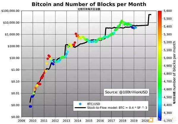 我根据SF(黑色)和实际比特币价格随时间绘制了比特币的模型价格,区块数作为颜色叠加。