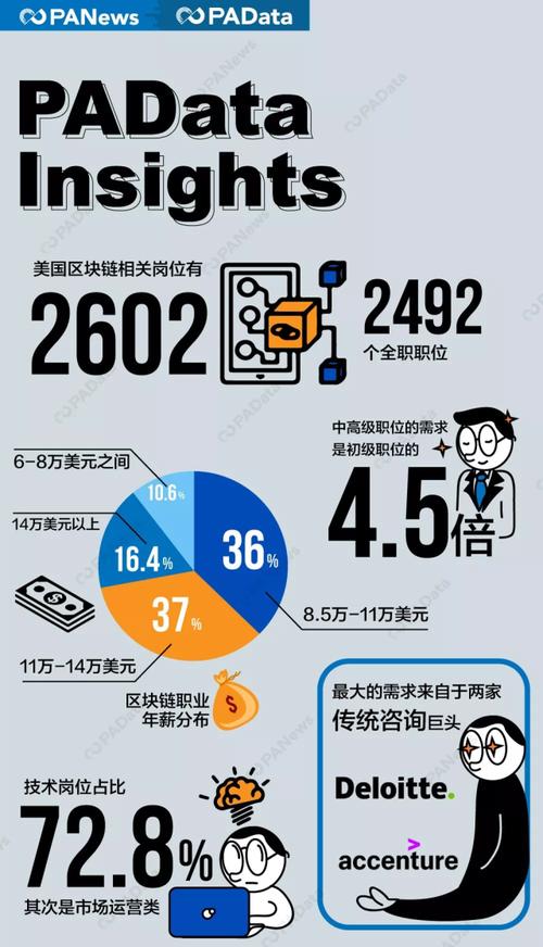 4.区块链职位,8.5万-11万美元的职位约占36%,11万-14万美元占37%,14万美元以上的有16.4%,剩余10.6%的职位年薪在6-8万美元之间;