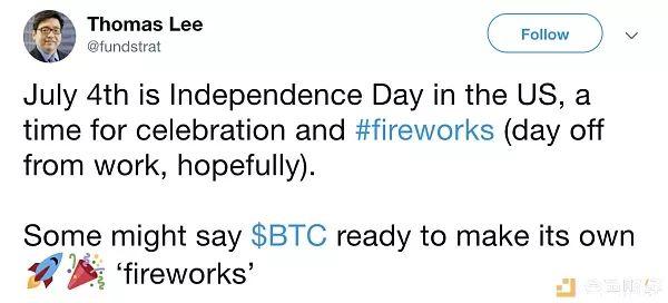 知名多头Tom Lee也在推特上表示,自从比特币突破1万美元大关以来,它的表现就大不相同了。我们将其定义为10级“FOMO”,因为它只代表了比特币历史上3%的时间。今天(7月4日)是美国独立日,这是一个值得放烟花庆祝的日子。那么比特币是不是也会在今天“放烟花”呢?让我们拭目以待吧。