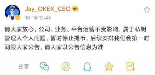 12月19日,OK交易所发布公告,宣布暂停提现服务,以配合相关部门调查。公告中称,此次调查涉及到一起网络安全事件,交易所正在积极配合执法机构的工作。
