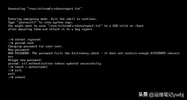 #切换至chroot环境chroot /sysroot#更改密码passwd root#创建标记文件touch /.autorelabel#退出exit#重启reboot