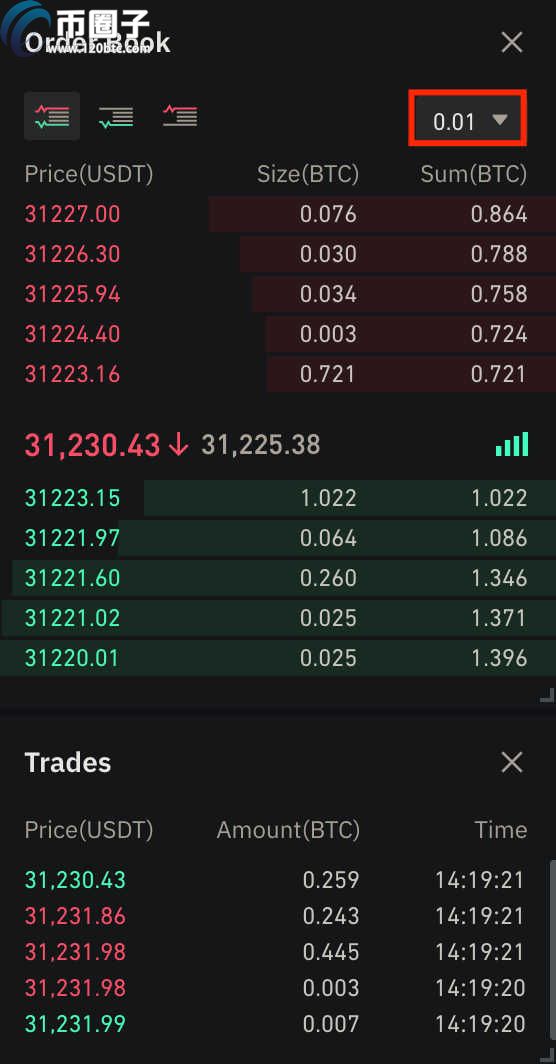 查看实时订单簿数据。在该区域右上角的下拉菜单中可以调整订单簿的精确度(默认为0.01)。在平台上实时查看之前的交易信息。