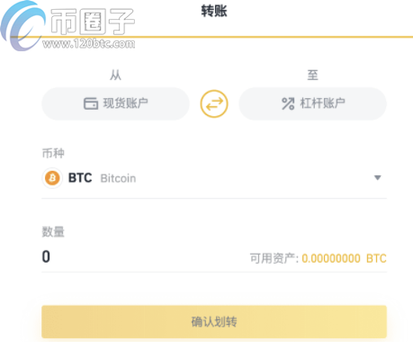 确认转账的方向为现货账户至杠杆账户,选择币种,输入转账数量,确认转账。