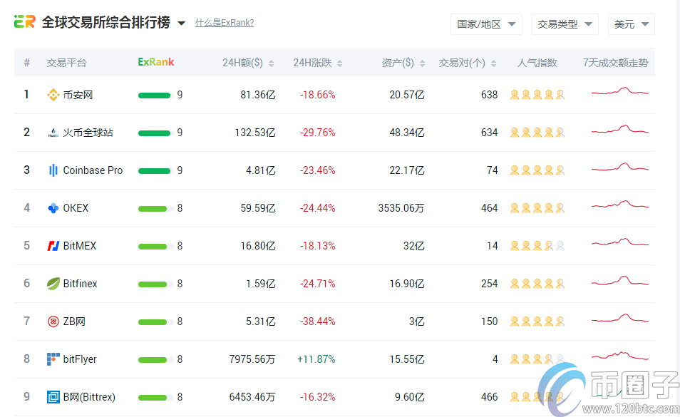 币安和火币网按照自残排名,币安排第5位,火币网排第1位;按照交易对排名,币安排第3位,火币网排第4位;按照24小时成交额排名,币安排第3位,火币网排第2位;按照综合实力排名,币安排第1位,火币网排第2位。