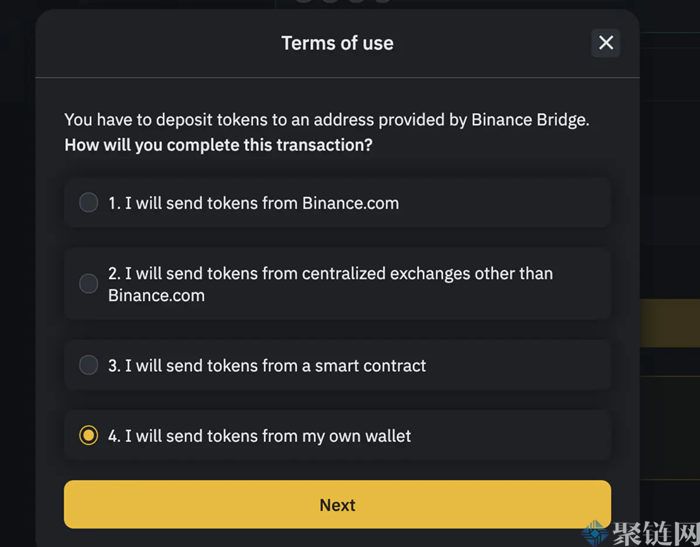然后点下一步,在这个弹窗中是问你要从哪里提供这个trx20的usdt,选4从钱包里转过来