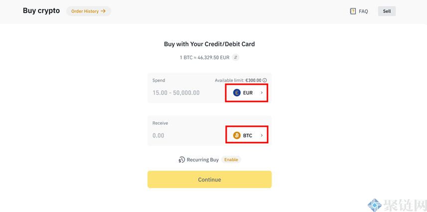 3、选择您要使用的法定货币和您要购买的加密货币。