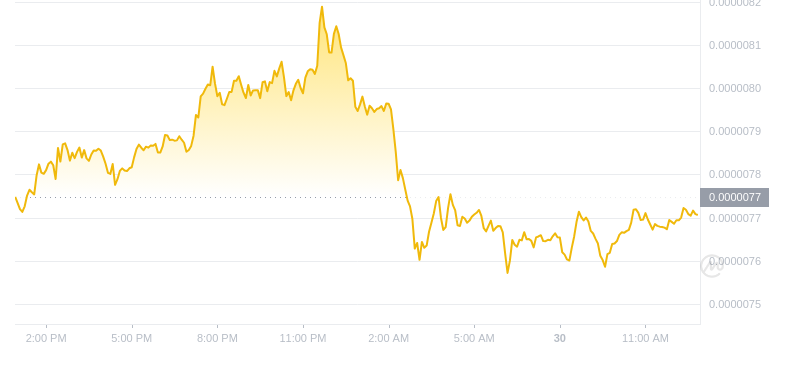 在过去 24 小时内,Pepe 价格下跌了 0.26%。这种下跌可能是由于市场对当前经济的不确定性以及对其他加密货币的获利了结所致。