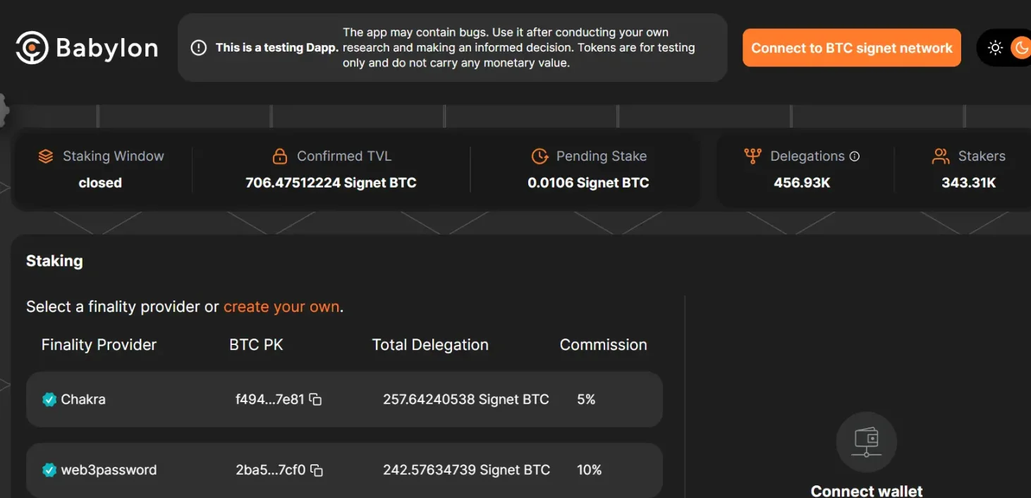目前,使用者可以透过Babylon Testnet4 测试体验质押BTC 的流程。