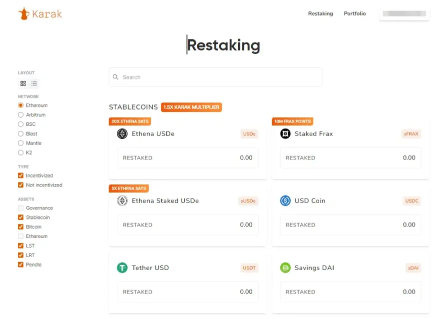与Eigenlayer 不同的是,Karak 旨在支持任何资产都能进行再质押,目前平台上支持的再质押资产包括ETH 、各类LST 和LRT 资产、还有USDT 、 USDC 、 DAI 、 USDe 等稳定币。