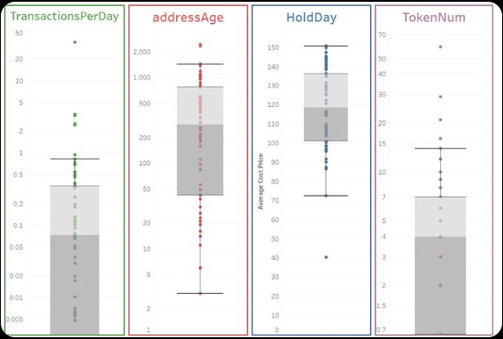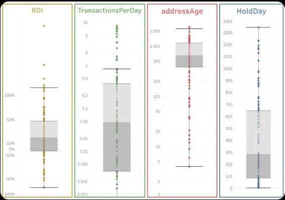 4)从addressAge来看,我们可以发现,中位数的钱包时间为654天,超过四分之三的钱包已经有1147天以上。这表明大部分钱包并非新生成地址,已经存在一段时间。