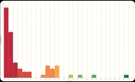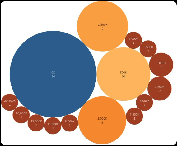上图为近60天增持大户的增持情况。最大的增持量是在0K~1K,大约在14万美金左右,一共有23个地址。其次数量为1K~2K的增持大户一共有15个。其次在2K~12K之间,各分布着不同的增持地址数量。但是到了14K以上,就比较少了,各类的增持只有1位。
