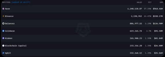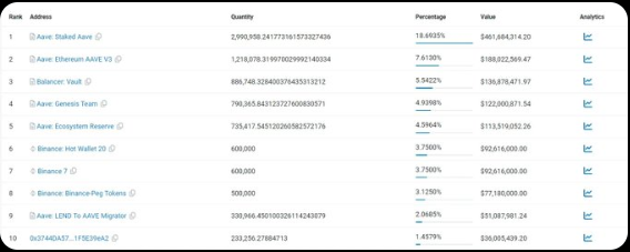 请注意,这里的持币大户在排除了项目方、dex、cex、mev、dex中间钱包、cex中间钱包等地址之后,持有AAVE的持币大户。这些持币大户可能包含了机构。
